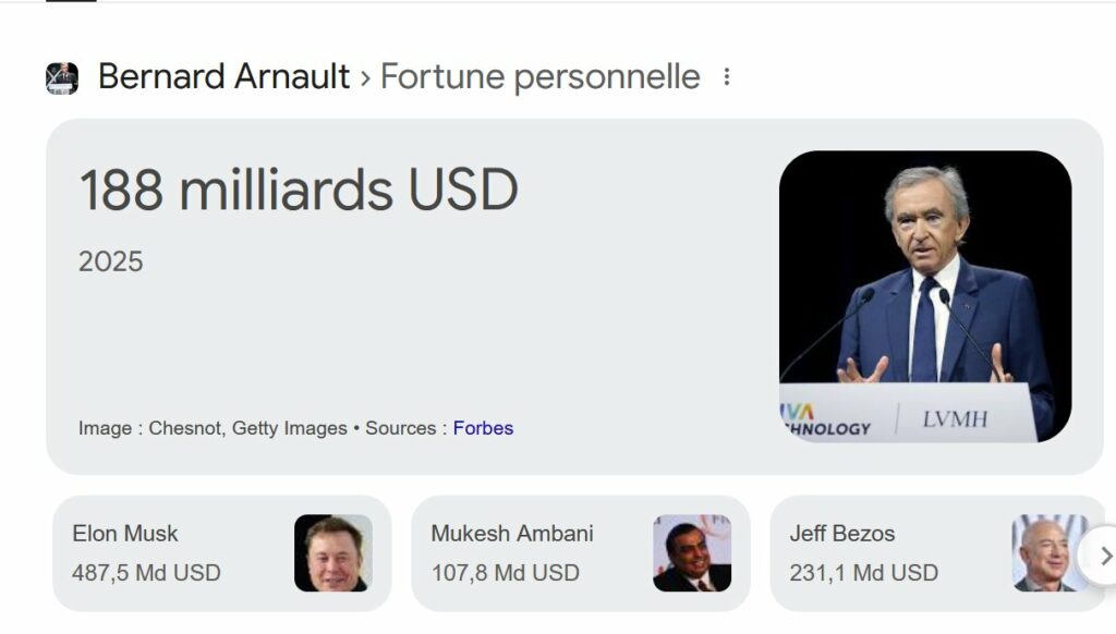 Mettons que M. Bernard A. possède un patrimoine financier de 150 milliards d’euros qu’il a placé dans une holding. Chaque annés, ses actions lui rapportent en moyenne entre 6 et 8% de rendement. Mettons 6%. Il touche donc un revenu économique d’environ 9 milliards.