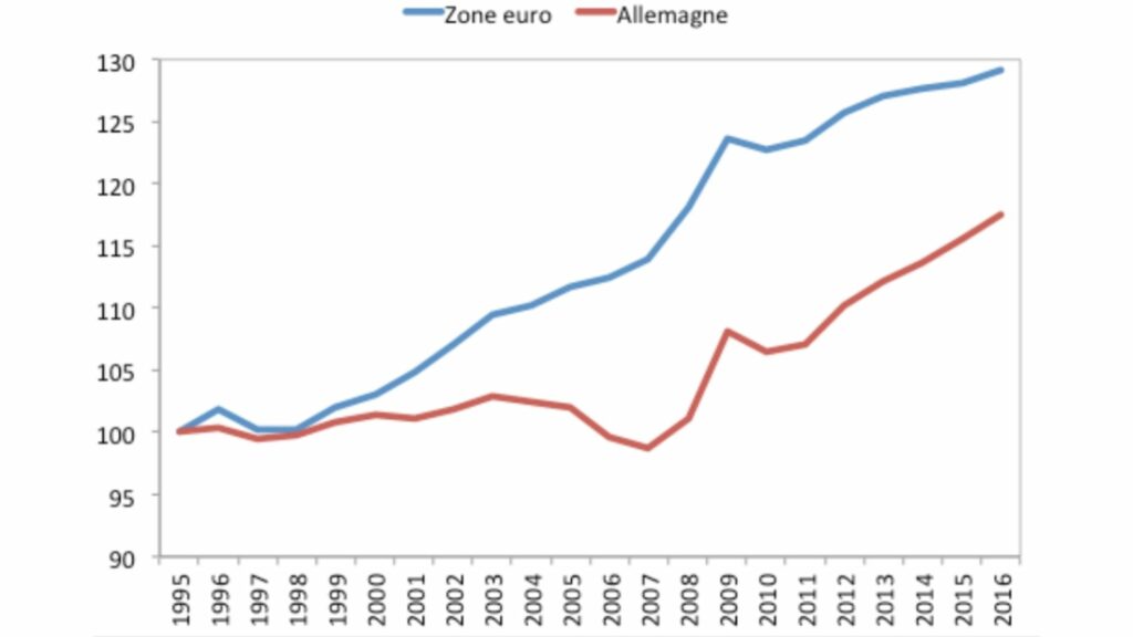 - Des politiques en faveur de la modération salariale : les coûts unitaires de main-d’œuvre de l’Allemagne par rapport à la zone euro ont chuté de 13,4 % entre 1995 et 2007 et l’écart s’est maintenu ensuite ;